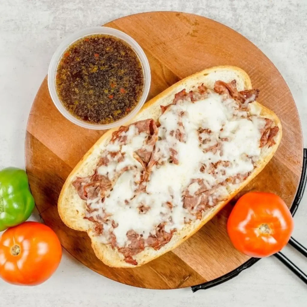 Indulge in our savory French dip, a crowd favorite. Tender roast beef, melted cheese, and a side of au jus for dipping. Served on a fresh, toasted baguette. Perfect for lunch or dinner. Try it with a side of crispy fries or a garden-fresh salad.